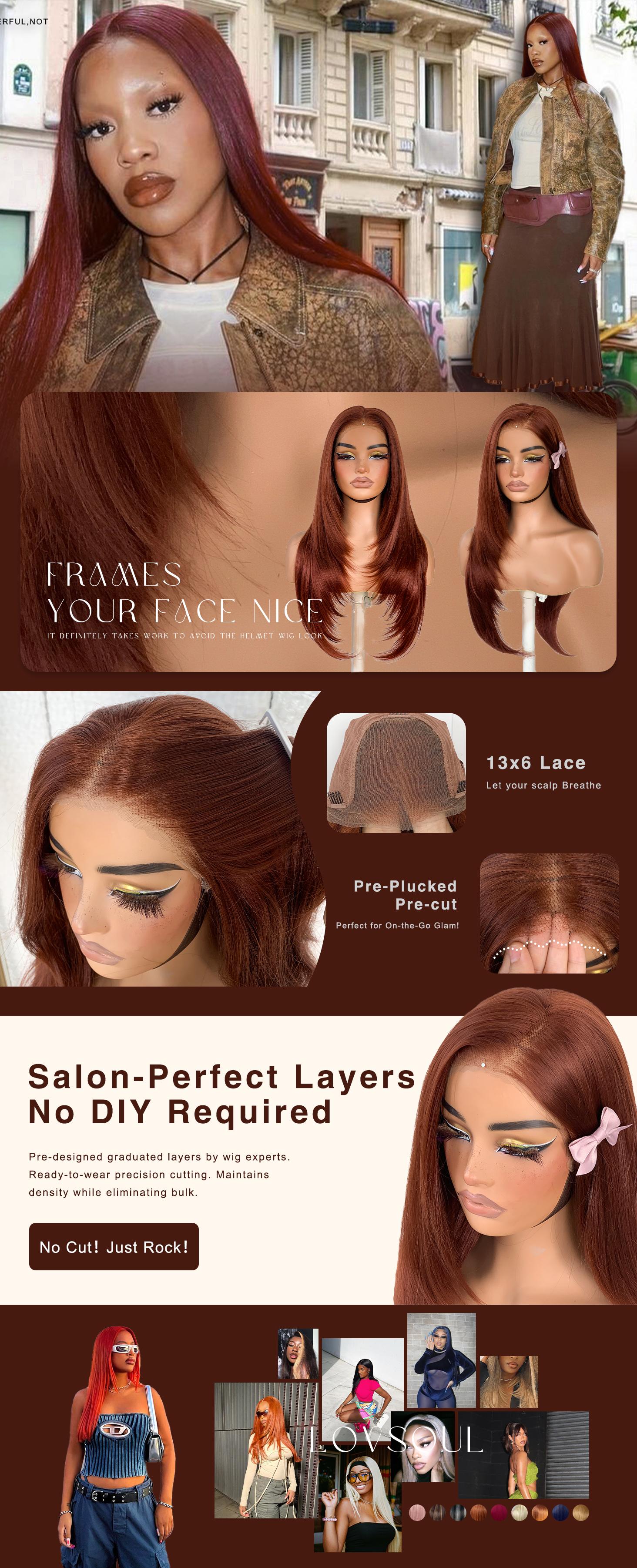 "Pre-designed graduated layers by wig experts. Ready-to-wear precision cutting. Maintains density while eliminating bulk."